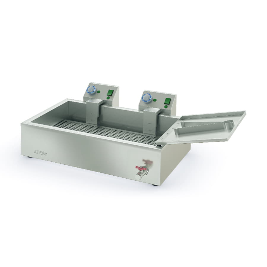 Блок управления легко снимается с ванны, что обеспечивает простоту санитарно-гигиенической очистки изделия. Чебуречница выполнена из пищевой нержавеющей стали.