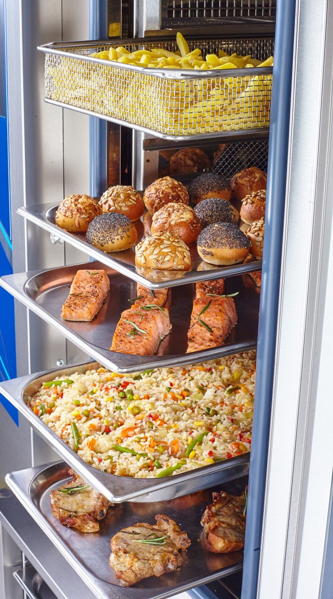 Среди ключевых характеристик пароконвектомата стоит отметить возможность регулировки влажности от 0% до 100% и точное поддержание температуры в пределах +/-1°C. Устройство оснащено многоточечным температурным щупом, который автоматически завершает процесс приготовления, когда блюдо достигает нужной степени готовности. Также предусмотрены 5 скоростей вращения вентилятора, что позволяет адаптировать режимы работы под различные типы продуктов, от крупных кусков мяса до легких десертов.