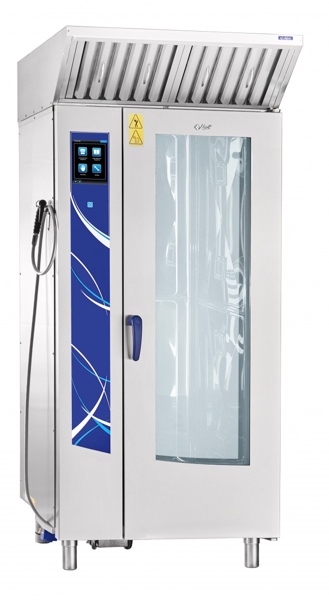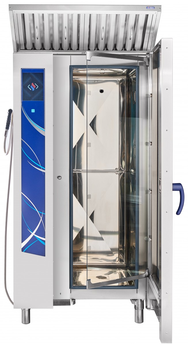 Дверца пароконвектомата открывается с помощью двухходового механизма, что обеспечивает безопасность от горячего пара. Вентилируемая конструкция и двойное термостойкое остекление предотвращают риск ожогов. Внутреннее стекло можно легко мыть с обеих сторон, а также оно предотвращает образование конденсата.