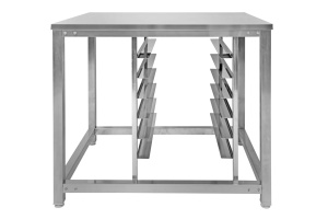 Столешница выполнена из нержавеющей стали AISI 430 с толщиной 0,6 мм, а подложка из ДСП имеет толщину 16 мм, что обеспечивает дополнительную прочность. Каркас конструкции изготовлен из крашенной или нержавеющей стали с толщиной металла 1,2 мм, а ножки имеют квадратный профиль размером 40х40 мм. Расстояние между направляющими составляет 65 мм, а опорные ножки можно регулировать в диапазоне ±20 мм.