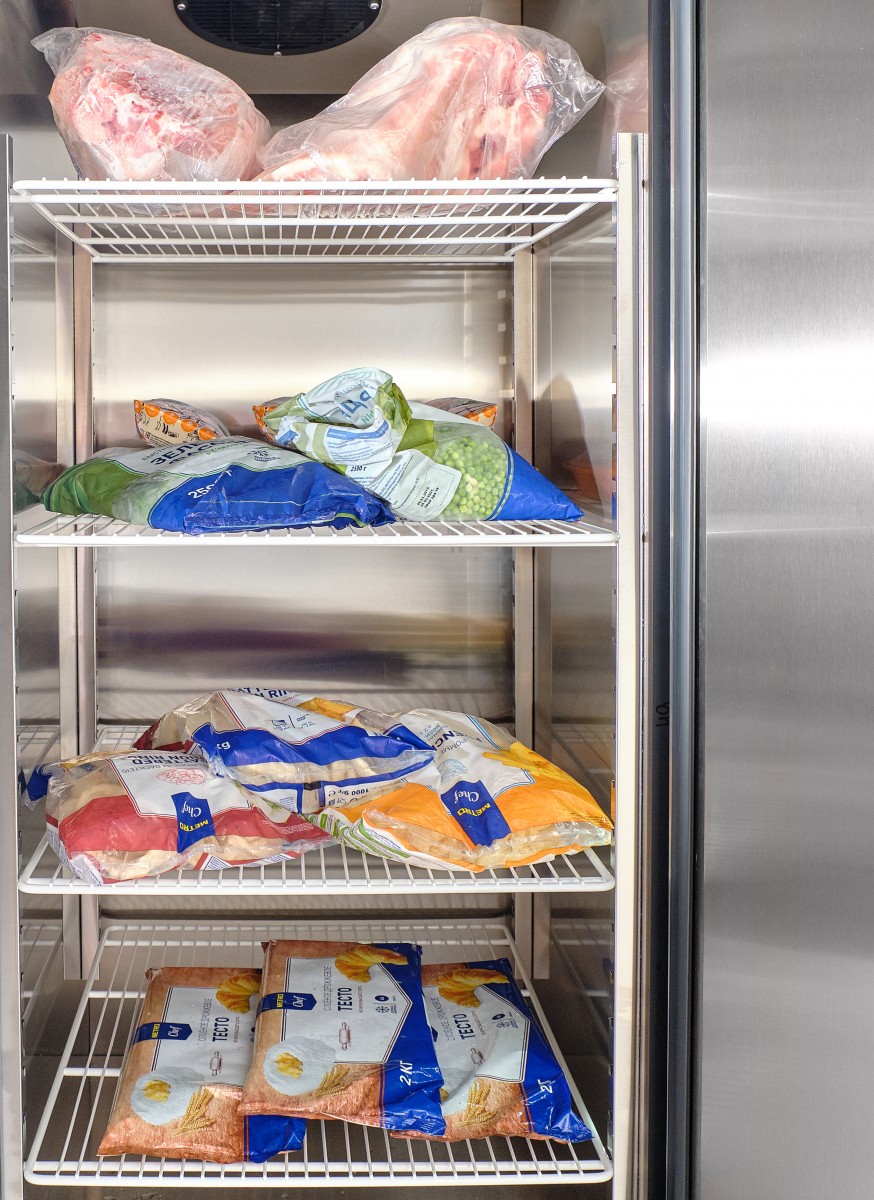 Шкаф оснащен четырьмя полками-решетками размером 545 на 488 мм, каждая из которых выдерживает нагрузку до 40 кг. Уплотнитель двери с магнитной вставкой обеспечивает надежную герметичность, а механический замок гарантирует безопасность содержимого. Светодиодное освещение внутреннего пространства позволяет легко находить необходимые продукты.