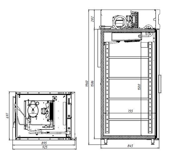 - Габариты: 697 мм (ширина) x 925 мм (глубина) x 1960 мм (высота)