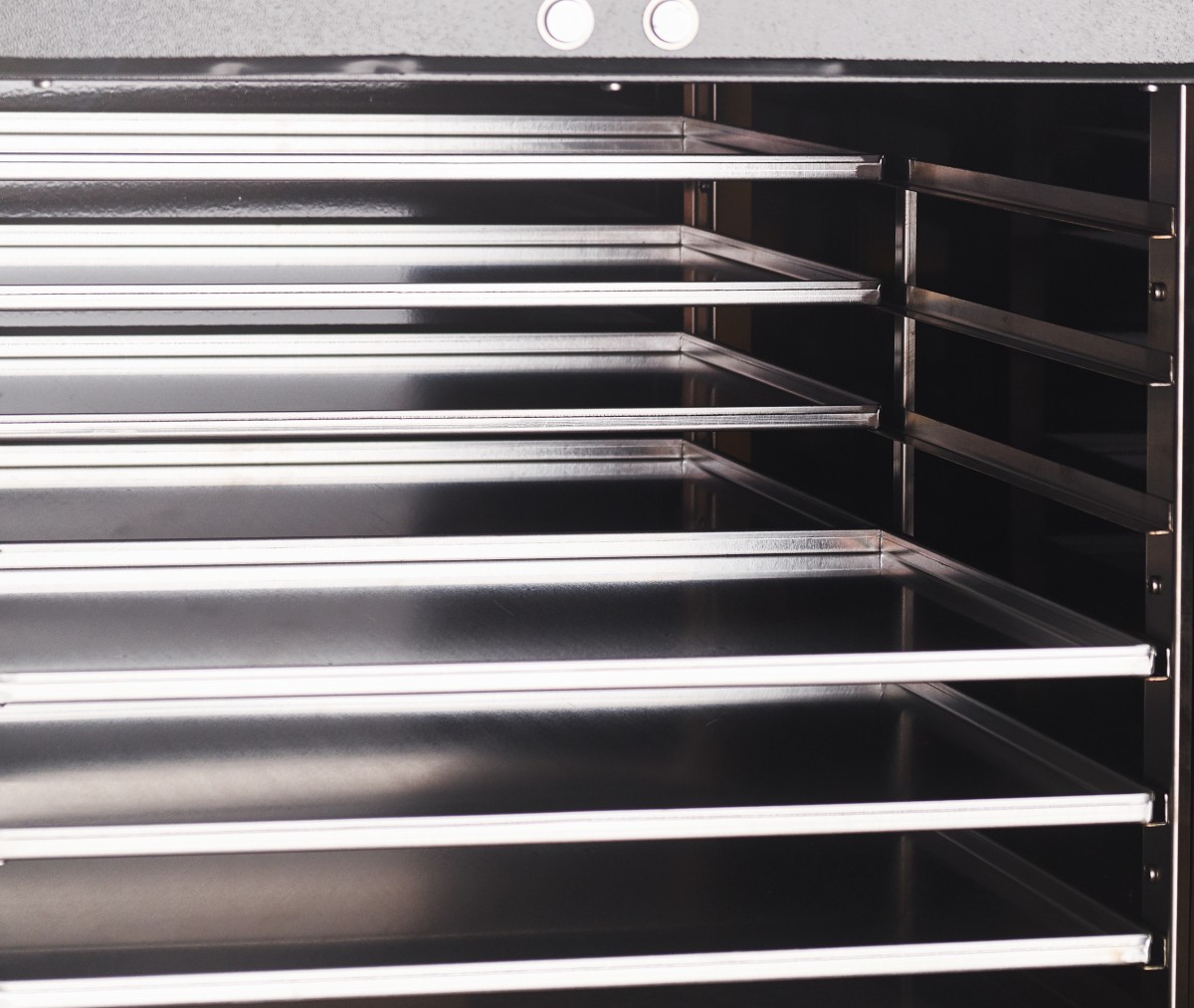 Шкаф имеет 12 уровней для противней размером 600х400 мм, с расстоянием между ними в 75 мм. Максимальная нагрузка на один противень составляет 2,4 кг, что делает его идеальным для работы с различными видами теста. Уровень влажности внутри шкафа варьируется от 50% до 95%, что способствует оптимальным условиям для расстойки.