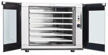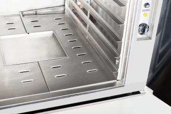 Устройство оснащено 12 уровнями, что позволяет разместить до 12 противней размером 600х400 мм. Внутреннее пространство шкафа выполнено из нержавеющей стали, что гарантирует долговечность и легкость в уходе. Для удобства эксплуатации предусмотрены: