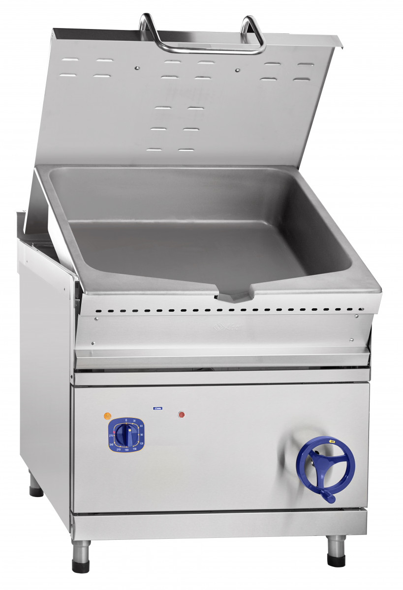 Сковорода также оборудована механизмом для подъёма и опускания чаши, что значительно упрощает процесс её очистки и обслуживания. Крышка устройства предотвращает потерю тепла и может фиксироваться в любом удобном положении. Кроме того, сковорода оснащена регулируемыми по высоте ножками, что позволяет адаптировать её под различные условия эксплуатации.
