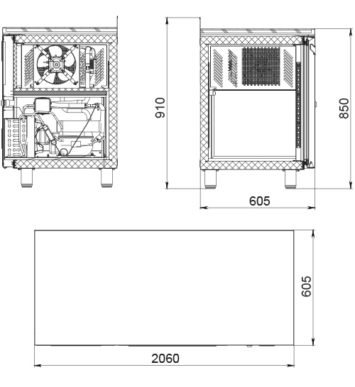 Холодильный агрегат расположен справа и имеет двухъярусную конструкцию, что обеспечивает легкий доступ и удобство в эксплуатации. Модель не требует гастронормированных направляющих, а ее конструкция включает четыре глухие двери, что позволяет эффективно организовать пространство для хранения.