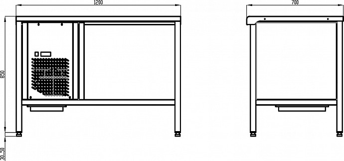 Холодильный агрегат расположен сбоку, что обеспечивает удобный доступ и экономит пространство. Стол имеет одну полку, что позволяет организовать хранение продуктов и ингредиентов. Автоматическая система оттайки упрощает эксплуатацию, а электронный терморегулятор обеспечивает точный контроль температуры.