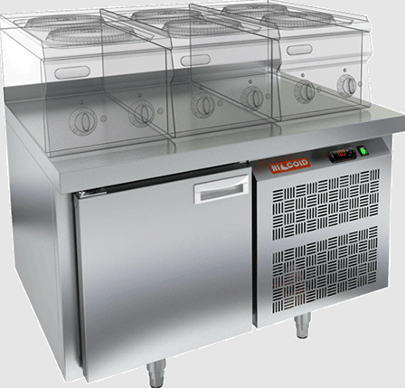 Объем морозильной камеры составляет 110 литров, что делает его идеальным выбором для заведений с высокой проходимостью. Холодильный агрегат расположен справа, что обеспечивает удобный доступ к содержимому. Стол соответствует гастрономическим стандартам, что позволяет использовать его с гастронормированными контейнерами.