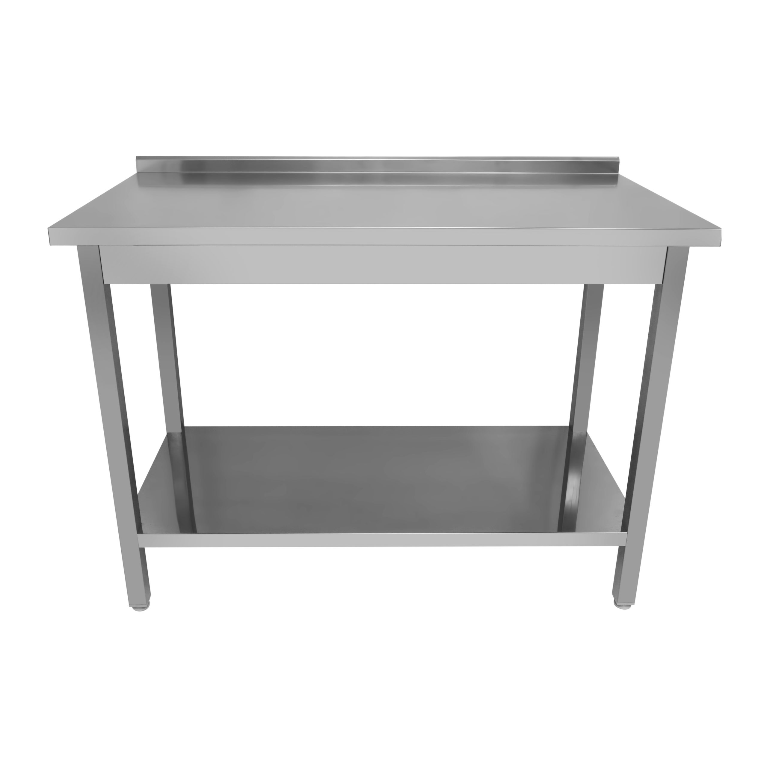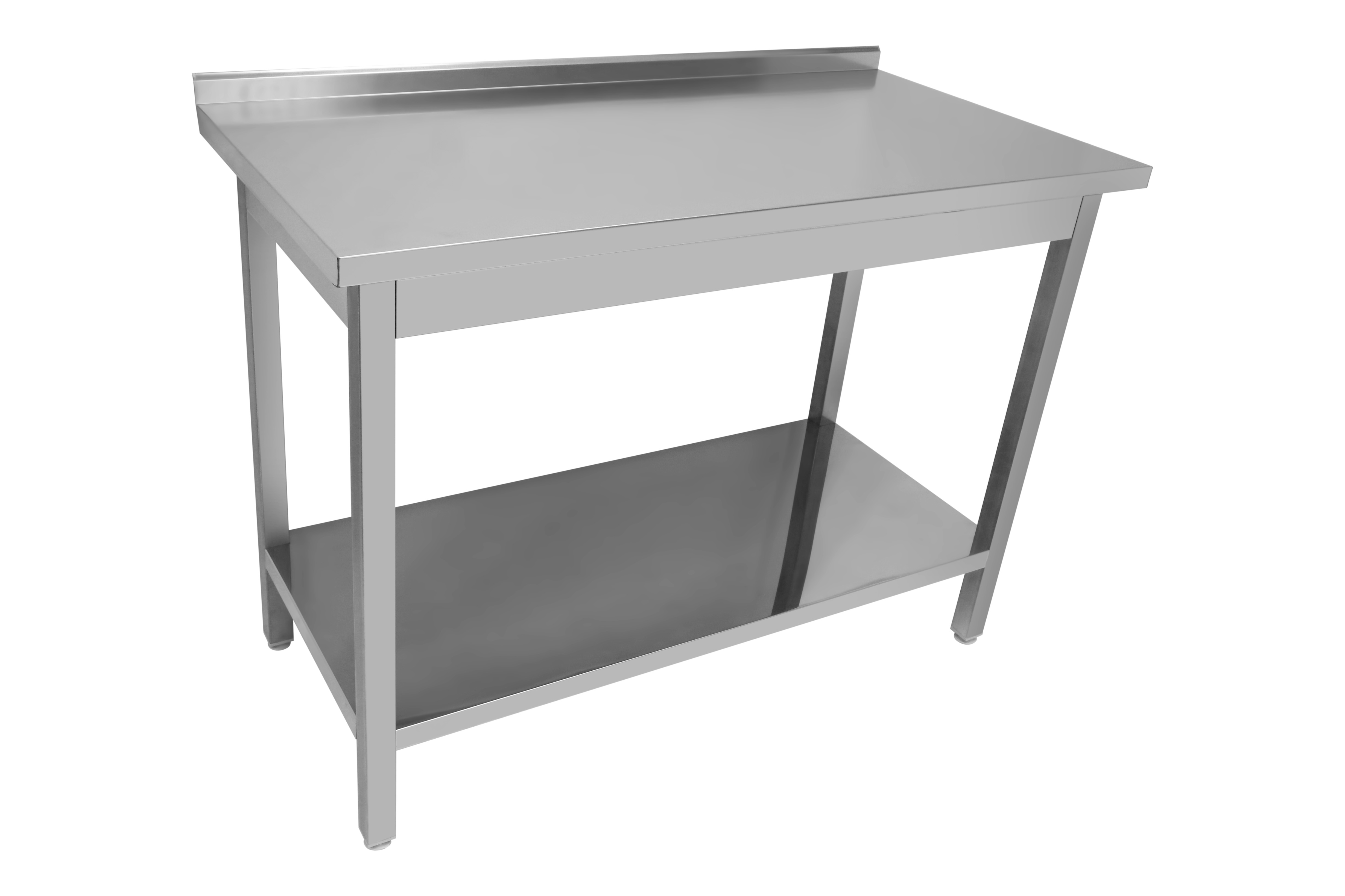 Стол имеет прямоугольную столешницу с бортиком, выполненную из пищевой нержавеющей стали AISI 430, которая дополнительно укреплена листом древесно-стружечной плиты с внутренней стороны. Это обеспечивает высокую прочность и предотвращает прогиб столешницы. Все кромки столешницы обработаны, что исключает риск травмирования персонала во время сборки, эксплуатации и санитарной обработки. Бортик позволяет устанавливать стол вдоль стены, минимизируя попадание остатков продуктов на пол и упрощая уборку.
