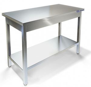 Стол на каркасе из уголка AISI430, столешница из AISI430 без борта. Внизу сплошная полка-накладка из AISI430.