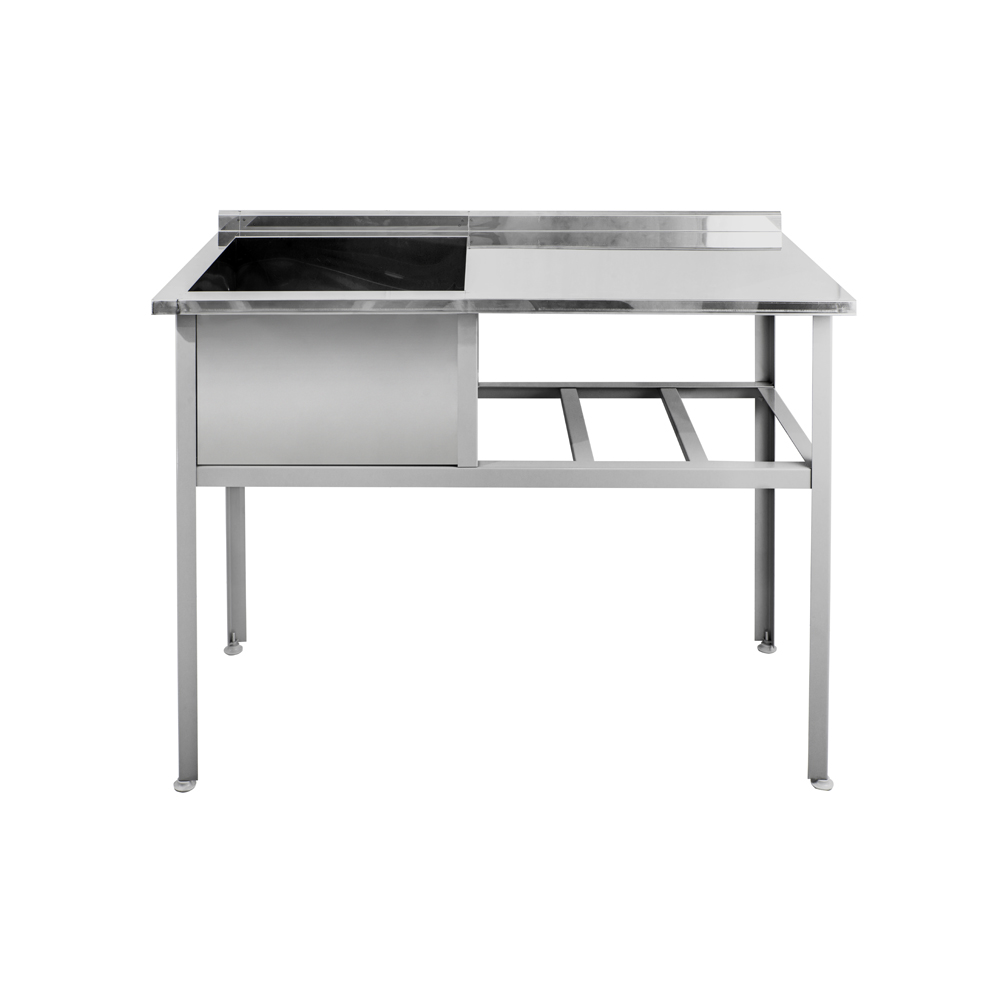 Изготовленная из высококачественной нержавеющей стали марки AISI430, ванна имеет глубину 300 мм, а её габариты составляют 1150 мм в ширину, 600 мм в глубину и 870 мм в высоту. В конструкции предусмотрен борт, а также полка под смеситель, однако отверстие для смесителя отсутствует. Внутренние размеры секции составляют 480 мм в длину, 480 мм в ширину и 300 мм в глубину, а диаметр сливного отверстия равен 50 мм.